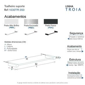 ITENS ENVIADOS: 1 toalheiro de banho 50cm, kit de parafusos e manual instrução instalação.