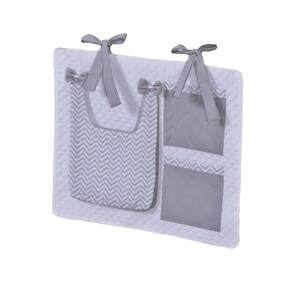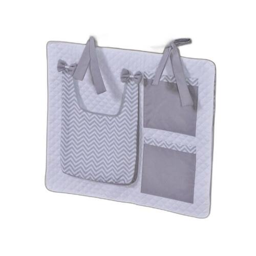 Porta Treco e Fralda Organizador Quarto de Bebê Menino Menina 1 Peça Com Laço Cor: Chevron cinza O porta fraldas é ideal pra ter sempre a mão os produtos mais no dia a dia com seu bebê. Nosso porta fralda/treco tem 2 bolsos menores, onde podem ser colocados produtos pequenos, e 1 bolso maior pra colocar as fraldas, roupas, toalhas ou itens maiores. Praticidade e decoração em um só produto. Sugestão de uso: Pendurado em varão ou no berço Contém na embalagem: 1 porta fraldas Medidas: 64cm larg x 54cm alt - 1 bolso 37cm alt x 27cm larg x 5cm prof - 2 bolsos 21cm alt x 18cm larg Composição: Matelado de microfibra 100% poliéster Tecido estampado e liso percal 180 fios 100% algodão - Foto ilustrativa, tonalidade da cor pode variar um pouco no produto real Produtos fabricados em Ibitinga-SP, a Capital Nacional do Bordado e do Enxoval.