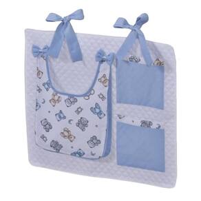 Porta Treco e Fralda Organizador Quarto de Bebê Menino Menina 1 Peça Com Laço Cor: Urso azul bebê O porta fraldas é ideal pra ter sempre a mão os produtos mais no dia a dia com seu bebê. Nosso porta fralda/treco tem 2 bolsos menores, onde podem ser colocados produtos pequenos, e 1 bolso maior pra colocar as fraldas, roupas, toalhas ou itens maiores. Praticidade e decoração em um só produto. Sugestão de uso: Pendurado em varão ou no berço Contém na embalagem: 1 porta fraldas Medidas: 64cm larg x 54cm alt - 1 bolso 37cm alt x 27cm larg x 5cm prof - 2 bolsos 21cm alt x 18cm larg Composição: Matelado de microfibra 100% poliéster Tecido estampado e liso percal 180 fios 100% algodão - Foto ilustrativa, tonalidade da cor pode variar um pouco no produto real Produtos fabricados em Ibitinga-SP, a Capital Nacional do Bordado e do Enxoval. Marca: Não Informado