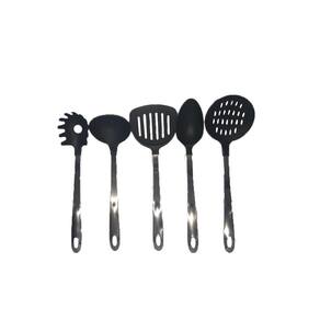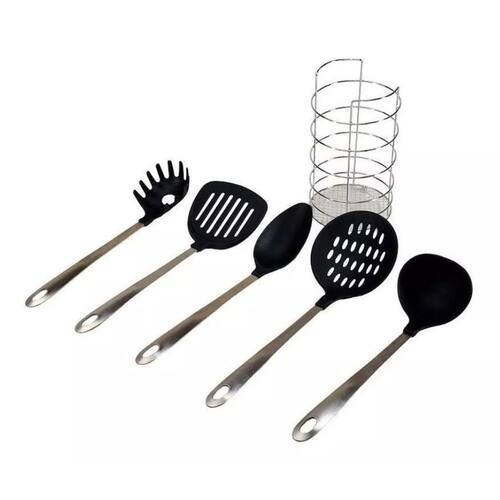 Kit Utensílios Cabo Inox, Preto 5 Peças Utensílios com suporte O Kit 5 utensílios e pote Plastico Gala é um charmoso conjunto de utensílios de cozinha que contém 1 colher de arroz, 1 concha, 1 escumadeira e uma espátula. É um produto ecológico e higiênico, pois o plastico tem propriedades antibactericidas. Quantidade: 5 peças Composição: plastico e aço inox Cor: Preto Descrição e Número de Peças: 1 Escumadeira plastico Cabo Inox 1 Pegador de Massas plastico Cabo Aço Inox 1 Concha plastico Cabo Aço Inox 1 Colher plástico Cabo Aço Inox 1 Espátula plastico Cabo Aço Inox