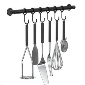 Em busca de uma maneira prática e elegante de organizar seus utensílios de cozinha ou objetos essenciais?Apresentamos o Porta Utensílios E Talheres 40cm Com 6 Ganchos Preto, a solução perfeita para adicionar funcionalidade ao seu espaço. Ideal para cozinhas, banheiros, lavanderias ou qualquer outro ambiente onde a organização seja essencial, o Porta Utensílios é uma escolha inteligente para quem busca praticidade e estilo em um único produto.Seu design moderno em preto adiciona um toque de elegância ao seu ambiente, transformando-o não apenas em uma solução funcional, mas também em um elemento decorativo que complementa o estilo da sua cozinha.Fabricado em Aço de alta qualidade, o Porta Utensílios é resistente à ferrugem e ao desgaste, garantindo durabilidade mesmo em ambientes úmidos, como cozinhas e áreas de serviço.Além disso, a durabilidade e resistência deste suporte garante uma organização confiável ao longo do tempo. Seja na cozinha, no banheiro ou em qualquer outro espaço, ele proporciona uma solução prática e elegante para manter seus utensílios organizados e acessíveis.ESPECIFICAÇÕES TÉCNICAS:Material: AçoAcabamento: Pintura Eletrostática EpóxiCor: Preto FoscoTipo De Fixação: ParafusosMEDIDAS:Largura: 40cmDiâmetro do tubo: 1,58cmEspessura do gancho: 2,5mmITENS INCLUSOS:1 - Porta Utensílios6 - GanchosParafusos e buchas para instalaçãoTampas para esconder os parafusos.Observação: Os utensílios apresentados são meramente ilustrativos e não acompanham o suporte, somente demonstram a funcionalidade do porta utensílios. Marca: Não Informado