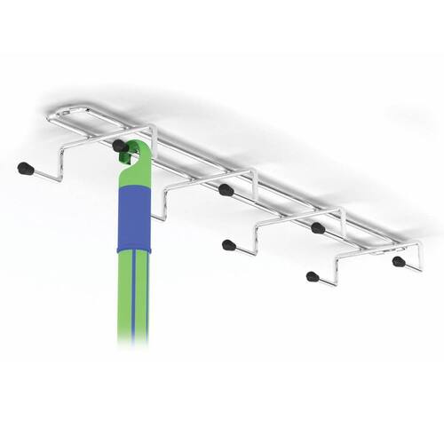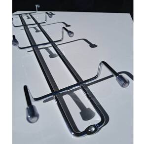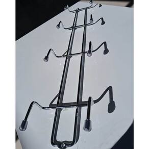 O suporte multiuso possui 8 ganchos, produzido em aço carbono cromado com ponteiras em PVC, que suportam até 2kg cada, tornando-o ideal para pendurar vassouras, rodos, esfregonas e outros itens de limpeza.