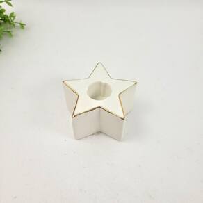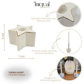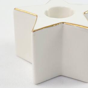 Porta Vela Castiçal Estrela Porcelana Branco Dourado 7Cm
