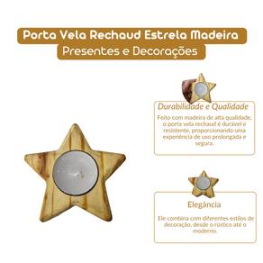 Este porta vela rechaud em formato de estrela, feito em madeira, é a escolha ideal para adicionar um toque de encanto e sofisticação à sua decoração. Com um design único e cheio de charme, ele cria uma atmosfera acolhedora e mágica, perfeita para iluminar qualquer ambiente com um toque especial.