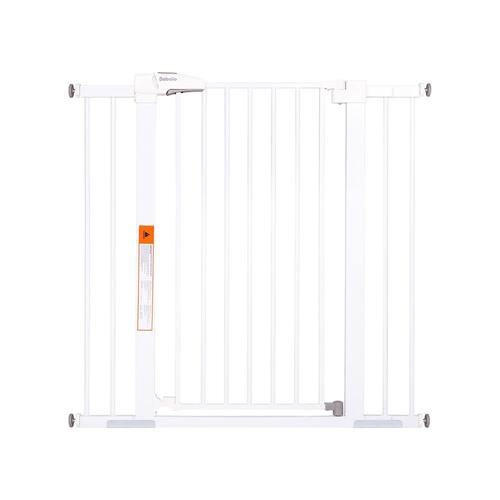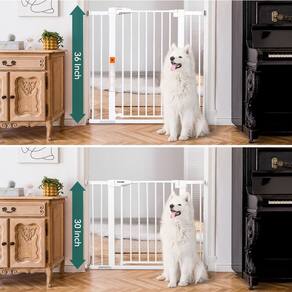 BABELIO Portão de bebê extra alto de 91 cm, portão de metal extra largo para cães de estimação montado sob pressão, fácil instalação, sem perfuração, sem necessidade de ferramentas, com protetores de parede e extensores (branco) - ALTA EXTRA: o portão de bebê Babelio atualiza para uma altura muito mais alta de 91 cm para evitar que crianças, filhotes ou cães maiores subam ou acessem áreas que não precisam ser. - Estreito a largo: se expande para caber em aberturas entre 66 e 101 cm de largura. Seja uma porta de banheiro estreita e porta de vaso sanitário, ou uma ampla porta e escadas, este portão de segurança é adequado. Certifique-se de medir sua abertura antes de comprar para garantir o ajuste adequado. - Instalação rápida e fácil: design de montagem de pressão que é rápido de configurar. Nenhuma ferramenta adicional é necessária para a instalação e não é necessário fazer furos na parede. NOTA: antes da instalação, a lacuna entre a trava do portão e a moldura NÃO é um defeito, desaparecerá depois de instalada. - Função de liberação automática: para maior conveniência com as mãos livres, este portão de segurança está equipado com uma função de fechamento automático que fecha suavemente a porta atrás de você e um recurso de retenção que mantém a porta aberta. Este portão balança em duas direções e abre sem esforço com uma só mão. - Trava fácil e segura: o portão do bebê é fácil de instalar na parede e tem uma porta de entrada com alças de trava dupla, permitindo que os adultos destranquem e levantem facilmente o portão do bebê com uma mão, mas é difícil para bebês. É muito adequado para escadas ou portas. - Amplamente aplicável e ajustável: inclui um kit de extensão de 14 cm de largura, dois kits de extensão de 7 cm de largura, 2 hastes de eixo Y, 2 ranhuras de reforço e 4 protetores de copo de parede. Perfeito para porta, corredor e fundo de escadas com uso de corrimão. O portão pode ser removido rapidamente da abertura para facilitar o armazenamento.