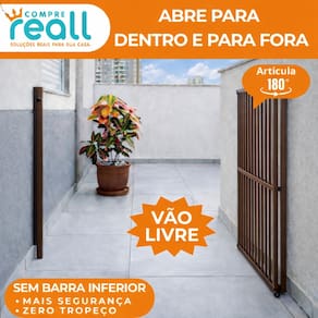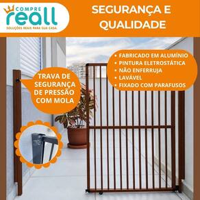 Portão de segurança para crianças e pets - COMPREREALL\n\nProteção inteligente, design moderno e total praticidade para o seu lar!\n\n2 em 1: abrir e correr\n\n- Abre para dentro ou para fora, articulando 180 graus\n- Pode correr lateralmente e encostar totalmente na parede\n- Libera completamente o vão para passagem\n- Muito mais praticidade no dia a dia\n\nSegurança redobrada: sem barra inferior\n\nDiferente da maioria dos portões do mercado, o modelo COMPREREALL não possui barra no chão.\n\n- Elimina riscos de tropeços\n- Ideal para idosos, crianças e circulação frequente\n- Permite passagem de carrinhos, aspiradores e cadeiras\n- Ambiente mais seguro e acessível\n- Fixado com buchas e parafusos na parede\n\nVersátil para bebês e cães\n\nPerfeito para:\n\n- Dividir ambientes\n- Limitar acesso a escadas e áreas perigosas\n- Criar espaços exclusivos para o pet\n- Manter a casa organizada e segura\n\nQualidade comprovada: alumínio com pintura eletrostática que não enferruja\n\nFabricado em alumínio leve, resistente e durável, com pintura eletrostática de alta qualidade.\n\n- Não enferruja\n- Resistente ao tempo e à umidade\n- Pode ser lavado\n- Ideal para áreas internas ou externas\n- Uso em casa, apartamento, campo ou praia\n\nMedidas do modelo:\n\n- Altura: 100 cm\n- Largura regulável: de 58 até 100 cm (não precisa de extensor)\n\nTrava de segurança\n\nTrava de pressão com mola, sistema que dificulta a abertura por crianças e pets de pequeno porte.\n\nCores disponíveis: branca, cinza, preta e marrom\n\nEscolha a que mais combina com seu ambiente\n\nIncluso no pacote:\n\n- 1 portão de segurança COMPREREALL\n- 4 buchas e 4 parafusos\n- Kit de espaçadores para instalação em locais com rodapé\n\nFabricado no Brasil. Produto 100% nacional com qualidade e garantia.\n\nPara medir corretamente:\n\nUtilize trena ou fita métrica e meça a largura do local em três pontos:\n\n- Parte superior\n- Parte do meio\n- Parte inferior\n\nConsidere sempre a menor medida encontrada.\n\nIsso garante encaixe perfeito e evita folgas ou dificuldades na instalação.