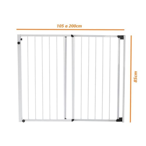 Possui 85 cm de altura e largura regulável, variando de 105 cm até 200 cm sem precisar de extensor além disso, o portão de correr reall articula 180º, ou seja, abre tanto para dentro como para fora. E o melhor: o vão é livre diferente de outros produtos no mercado, que possuem uma barra na parte inferior, o portão de correr reall tem um design exclusivo, garantindo maior segurança para sua família pois não há risco de tropeçar.