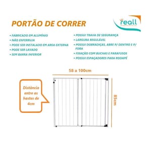 Possui 85 cm de altura e largura regulável, variando de 58 cm até 100 cm sem precisar de extensor além disso, o portão de correr reall articula 180º, ou seja, abre tanto para dentro como para fora. E o melhor: o vão é livre diferente de outros produtos no mercado, que possuem uma barra na parte inferior, o portão de correr reall tem um design exclusivo, garantindo maior segurança para sua família pois não há risco de tropeçar.