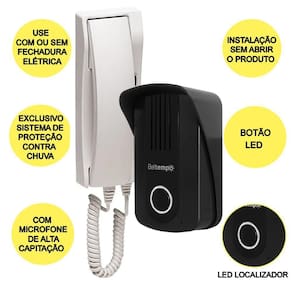- não entra água, pode ser instalado com ou sem capa de chuva, não estraga com o sol, feito em abs super resistente. - botão para acionamento de fechadura, pode ser usado com ou sem fechadura elétrica - aceita até mais 2 extensões, você pode ter 3 pontos de atendimento dentro da sua casa ou empresa, muito mais comodidade, muito útil para pessoas que tem 2 casas no mesmo terreno.