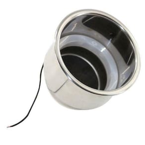 Porto copo de embutir em aço inox com led Modelo em aço inox com iluminação em led 12 volts marinizado a prova de água. Alimentação em 12v com led na cor azul. Encaixe para copos e garrafas com dreno, encaixe para garrafas até 93mm, em aço inox polido.