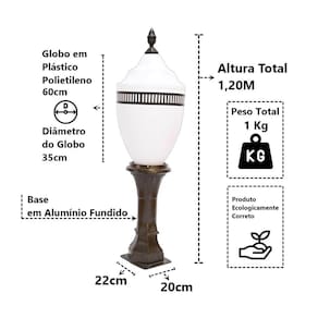 Poste para jardim, ótimo para guiar a circulação de pessoas e veículos. Valorizar o espaço destacando os pontos positivos e ocultando os pontos negativos. Dê charme para sua iluminação externa. Pode ser encontrado em diversos modelos e tamanhos. Geralmente são indicados tanto para a decoração, como também para atender ao quesito de iluminação, logo, é um produto que atende muito bem essas duas necessidades.