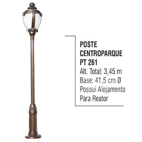 Poste Centroparque P/ Jardim de Alumínio 01 Luminária 3,30m Poste para jardim, ideal para condomínios, jardins, praças, parques, estacionamentos, vias urbanas e áreas externas em geral. Pode ser utilizada em regiões de praianas, pois não sofre ação da maresia. Ótimo custo benefício. Possui Alongamento para reator. Características: Material Alumínio Fundido e Vidro. Cores disponíveis: Preta, Branca, Dourado Craqueado. Favor informar no campo de mensagem a cor desejada. Se o comprador não se prounciar quanto a cor, será enviada a cor padrão Dourado Craqueado. Medidas Altura total: 3,30m. Base: 41,5cm. Poste sem lâmpadas. Lâmpadas Lâmpada Compatível E-27. (NÃO INCLUSA). Itens Inclusos: 01 Poste Centroparque P/ Jardim de Alumínio 01 Luminária 3,30m Código: PT279. ATENÇÃO - A instalação é de inteira responsabilidade do comprador. undefined