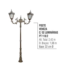 Poste Colonial Veneza Jardim de Alumínio 02 Luminária 2,42m