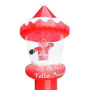 Especificações Técnicas: - Tipo: Enfeite Inflável Portal com Papai Noel e Neve. - Inscrição no poste: Feliz Natal. - Altura: 2,75 metros. - Alimentação: Conexão direta à tomada. - Voltagem: Bivolt. - Manutenção: O produto deve permanecer ligado à tomada para manter-se inflado. - Material: Poliéster impermeável e componentes eletrônicos. - Iluminação: 1 LED incorporado, indicado para uso interno e externo.