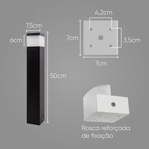 ESPECIFICAÇÕES TÉCNICAS DO POSTE: Cor: PRETO Aceita lâmpadas LED, Fluorescente ou Incandescente. Material: Alumínio e Policarbonato Bivolt: 110/220 v Soquete: E-27 (Rosca padrão) Tamanho: 50 cm de Altura. Dimensões: 7,5 cm de largura x 7,5 cm de profundidade Utiliza 1 lâmpada