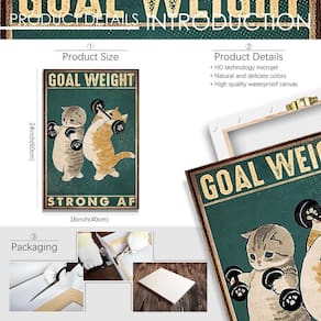 Eleve seu espaço de vida com a arte de parede "Funny Cat Target Weight Workout" – um pôster de musculação com halteres para gatos de academia que combina humor, inspiração e estilo. Esta impressão em tela de alta qualidade é perfeita para decorar sua sala de estar, quarto, escritório ou qualquer cômodo onde você precise de um impulso motivacional. A estética minimalista vintage e o design retrô moderno garantem que esta obra de arte se encaixe perfeitamente em uma variedade de estilos de interiores. Seja você um entusiasta do fitness ou simplesmente desfrute de uma decoração única e peculiar, este pôster com gatos atleta animais trará um sorriso ao seu rosto e inspirará você a alcançar seus objetivos. Adicione um toque de diversão e motivação às suas paredes com esta peça excepcional de arte de parede hoje! - Motivação fitness inspiradora: este pôster engraçado de treino para gatos apresenta um gato de academia envolvido no levantamento de peso, proporcionando uma mensagem inspiradora e motivacional que se encaixa perfeitamente em qualquer academia, sala de estar ou quarto. Ideal para entusiastas de fitness que amam um toque de humor. - Impressão em tela de alta qualidade: Feita de material de tela premium, esta arte de parede garante cores vibrantes e durabilidade. O design minimalista complementa a estética moderna e vintage, tornando-a uma adição versátil à sua decoração. - Decoração de quarto versátil: Adequado para vários espaços como banheiros, quartos, salas de estar, escritórios, cozinhas de fazendas e muito mais. Se você deseja adicionar um elemento peculiar à área do seu sofá ou criar um ponto focal no seu espaço de treino, este pôster oferece. - Estilo retrô descolado: com seu estilo retrô e minimalista vintage, esta impressão de fisiculturismo de gato adiciona um toque único e artístico a qualquer cômodo. A mistura de humor e inspiração atlética a torna uma peça de destaque que despertará conversas e admiração. - Tema de atleta animal estético: Apresentando atletas animais como gatos envolvidos em musculação e levantamento de peso, este pôster traz uma vibração divertida e poderosa para sua casa. Perfeito para aqueles que apreciam a interseção de fitness, arte e humor.