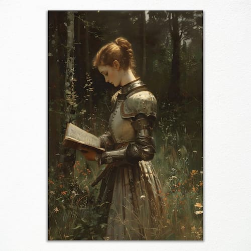 Esta impressão artística captura lindamente uma cena serena de uma cavaleira caminhando por uma floresta verde e exuberante. Vestida com armadura brilhante, ela contrasta com a beleza de seu entorno. Com um livro em suas mãos, ela lê atentamente enquanto caminha, incorporando uma mistura harmoniosa de força e intelecto. A luz solar filtra através das árvores, lançando um brilho quente nela e nas flores silvestres, criando uma atmosfera encantadora e pacífica. Esta peça celebra o equilíbrio entre coragem e sabedoria, tendo como pano de fundo a tranquilidade da natureza.