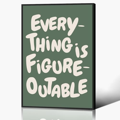 Eleve seu espaço com positividade e estilo usando nossa coleção de arte de parede com citações inspiradoras. Esta coleção reúne cores vibrantes e mensagens edificantes, perfeitas para adicionar inspiração a qualquer cômodo. Do pôster verde moderno "Everything is Figureoutable" à arte rosa preppy "What's the Best That Could Happen", essas impressões fazem uma declaração com design ousado e motivação. Ideal para quartos, escritórios ou dormitórios, esta coleção de arte de parede traz um toque de cor e um impulso de confiança à sua decoração. - Coleção de arte de parede com citações inspiradoras: um conjunto selecionado de pôsteres motivacionais que misturam cores vibrantes com mensagens inspiradoras, projetado para iluminar seu dia e elevar seu espaço - Pôster verde moderno "Everything is Figureoutable": com um tom verde moderno e letras ousadas, esta impressão adiciona um lembrete elegante de que cada desafio pode ser resolvido, perfeito para qualquer escritório ou área de estudo - Arte rosa preppy "What's the Best That Could Happen": Com um fundo rosa alegre, esta impressão estimula o otimismo e uma mentalidade positiva, tornando-a ideal para quartos, dormitórios ou espaços criativos - Pôster divertido laranja rosa "You Are Amazing": uma combinação única de rosa e laranja, esta impressão adiciona um toque de cor e um lembrete de autoestima, ótimo para entradas, quartos ou como um impulso diário de confiança - Impressões em tela de alta qualidade: Impresso em tela premium com cores vibrantes e resistentes ao desbotamento, esses pôsteres garantem um acabamento duradouro e de alta qualidade que aprimora qualquer estilo de decoração