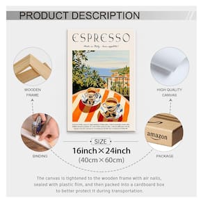 Cartazes vintage de café, com seus tons quentes e fontes nostálgicas, adicionam uma sensação de calor e conforto a qualquer espaço. Estes pôsteres não apenas mostram um amor pela cultura do café, mas também evocam memórias dos bons velhos tempos. Na cozinha ou no canto do café, combine pôsteres de bebidas de diferentes estilos e tamanhos para criar uma parede de galeria cheia de personalidade, que não é apenas visualmente atraente, mas também cria uma atmosfera relaxante e aconchegante. Seja compartilhando uma xícara de café com amigos ou desfrutando de um tempo tranquilo sozinho, essa decoração pode adicionar um toque de interesse à vida. - Arte de parede em tela de cozinha: o tamanho estético dos pôsteres de bebidas é de 40,6 x 61 cm, os pôsteres modernos são embrulhados e esticados sobre moldura de madeira, para criar um efeito 3D imersivo que torna a obra de arte ótima - Cartazes duráveis e de alta qualidade: arte de parede de alimentos Use tinta de proteção ambiental de alta qualidade, não desbota facilmente, cores vivas, à prova d'água, resistente a UV, sem odor. A decoração de cafeteria adicionará um toque de estilo e personalidade às suas paredes - Imagens vintage: pôsteres de café vintage, com seus tons quentes e fontes nostálgicas, adicionam uma sensação de calor e conforto a qualquer espaço. A arte de parede em tela vintage fornece decoração para cozinha, sala de jantar, bar, dormitório, sala de estar, quarto, apartamento, hotel, escritório - Presentes divertidos: na cozinha ou no canto do café, tamanhos para criar uma parede de galeria cheia de personalidade, que não é apenas visualmente atraente, mas também cria uma atmosfera relaxante e aconchegante. Decoração de parede, seja dado como presente de aniversário, Natal, inauguração de casa ou qualquer outra ocasião especial, a arte do café surpreenderá e encantará o destinatário - Serviço pós-venda: Valorizamos muito sua experiência de compra, se você tiver algum problema com a arte de parede de café. Você pode entrar em contato conosco por e-mail na primeira vez. Esperamos resolver quaisquer problemas que você possa encontrar de forma rápida e eficiente