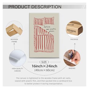 Este pôster pop art chamado "Just Five More Minutes Please" combina linhas simples com um fundo vermelho brilhante para criar uma atmosfera única e animada. As palavras alegres e bem-humoradas no pôster transmitem o desejo de "um pouco de tempo de descanso" na vida, o que não apenas faz as pessoas sorrirem, mas também evoca o lindo anseio das pessoas por momentos relaxantes. O vermelho simboliza entusiasmo e vitalidade, injetando instantaneamente uma vitalidade vigorosa no espaço e fazendo as pessoas se sentirem animadas. Não é apenas uma obra de arte, mas também um espelho na vida, refletindo nossa busca de conforto e relaxamento. Ao mesmo tempo, é um lembrete dos belos momentos da vida, que podem inspirar uma atitude positiva em relação à vida e nos lembrar de reservar um tempo para desfrutar de um momento de tranquilidade na vida agitada - Decoração de parede engraçada: O tamanho minimalista da arte de parede é de 40,6 x 61 cm, esta decoração de parede divertida é enrolada e esticada sobre moldura de madeira, para criar um efeito 3D imersivo que faz a obra de arte parecer ótima - Cartazes duráveis e de alta qualidade: arte de parede divertida Use tinta de proteção ambiental de alta qualidade, não desbota facilmente, cores vivas, à prova d'água, resistente a UV, sem odor. Decoração de parede moderna adicionará um toque de estilo e personalidade às suas paredes - Decoração de parede com citações: pôsteres vermelhos não são apenas uma obra de arte, mas também um espelho na vida, refletindo nossa busca de conforto e relaxamento. Linda decoração de parede que pode fornecer decoração para cozinha, sala de jantar, bar, dormitório, sala de estar, quarto, apartamento, hotel, escritório - Presentes fofos: a decoração de parede de meados do século é um lembrete dos belos momentos da vida, que podem inspirar uma atitude positiva em relação à vida. Seja dado como aniversário, Natal, presente de férias, inauguração de casa ou qualquer outra ocasião especial, a arte de linha surpreenderá e encantará o destinatário - Serviço pós-venda: Valorizamos muito sua experiência de compra, se você tiver algum problema com a decoração de parede minimalista, por e-mail na primeira vez. Esperamos resolver quaisquer problemas que você possa encontrar de forma rápida e eficiente