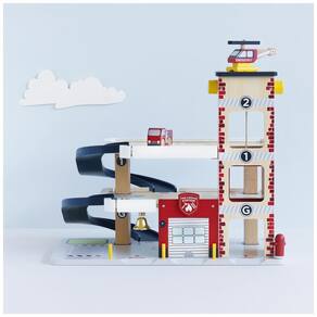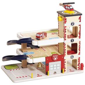 Seguro, de Alta Qualidade e Proveniente de Florestas Sustentáveis: Decorado com tintas não tóxicas à base de água, resistentes a lascas e testado de acordo com os mais altos padrões de segurança. Este conjunto de garagem de incêndio e resgate, com carro de bombeiros e helicóptero exclusivos, é um brinquedo ideal para despertar a imaginação das crianças.