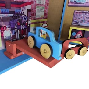 Acompanha 3 carrinhos em madeira, 2 cones de sinalização, elevador para carros, armário embutido para guardar ferramentas, bombas de gasolina.