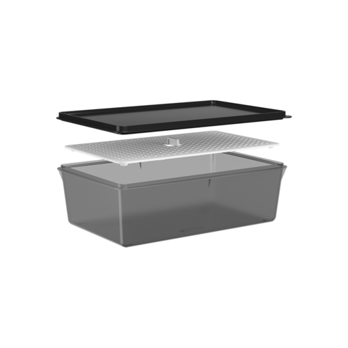 O Pote Basic com Grade de até 4,5 litros da Linha Potes Basic/Coza é versátil, resistente e possui design moderno. Com tampa em Preto, grade branca e estrutura em Fumê é prático e bonito.