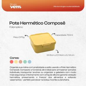 O Pote Composê Hermético 750ml foi desenvolvido para oferecer praticidade e organização, adaptando-se às diferentes necessidades do dia a dia. Com dimensões compactas e empilháveis, ele é ideal para transportar marmitas, organizar a geladeira ou até mesmo conservar alimentos no freezer.