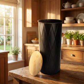 Pote de Metal com Tampa de Bambu 2 Litros Fosco Vedação Cor: Preto Pote de Metal com Tampa de Bambu Com capacidade para 2 litros, ele é perfeito para armazenar grãos, cereais e biscoitos. Seu design fosco e a tampa de bambu não só garantem uma aparência moderna, mas também proporcionam uma vedação eficaz, mantendo seus alimentos frescos por mais tempo. Ideal para quem busca praticidade e elegância na hora de cozinhar.