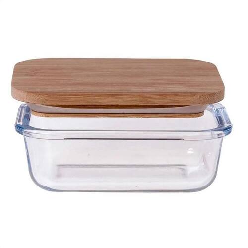 Pote retangular de vidro borossilicato com tampa de bambu e silicone de vedação. Seu formato retangular e empilhável ajuda a aproveitar melhor o espaço. com a combinação da vedação de silicone e o bambu anti bactericida, esse pote é perfeito para armazenar alimentos.