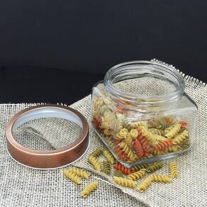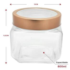 Pote de vidro quadrado com tampa com janela transparente de acrílico, perfeito para armazenar grãos, guloseimas, massas e etc.. Possui tampa rosqueável com detalhes na cor cobre.