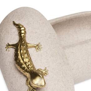 O corpo do pote apresenta textura suave e tampa decorada com uma lagartixa dourada em alto-relevo, que se destaca como elemento artístico. Ideal para compor ambientes modernos, rústicos ou contemporâneos, tornando-se um detalhe único na sua decoração.