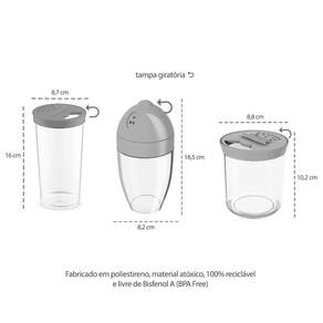Contêm: 1 Pote de 300ml Medidas: 16,5 x 8,2 cm 1 Pote com Tampa Medidas: 16 x 8,7 cm 1 Pote com Tampa Medidas: 10,2 x 8,8 cm Material: Poliestireno (PS)