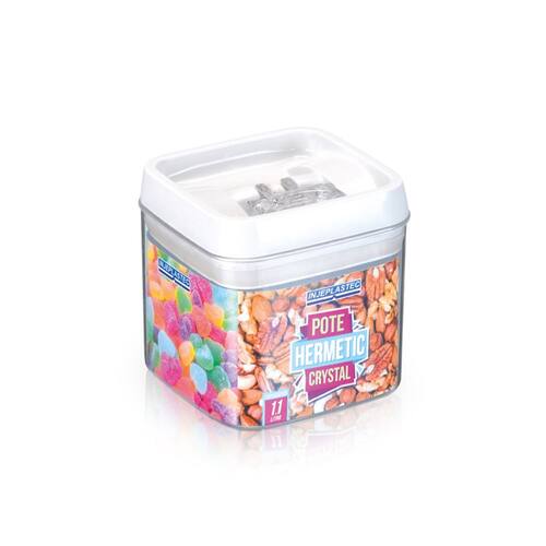 modelo: quadrado acrílico capacidade: 1,1 litros dimensões: c. 12,6 x l. 12,6 x a. 13 cm cor: acrílico transparente e tampa branca