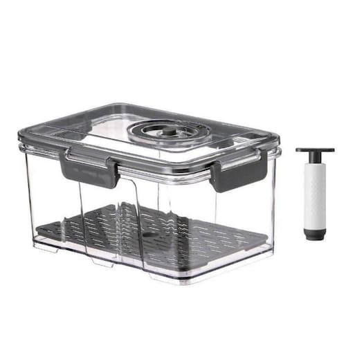 Máxima conservação dos alimentos com sistema de vedação a vácuo Dimensões práticas: 22,5 cm de comprimento 15 cm de largura 12 cm de altura Acompanha bomba manual para fácil remoção do ar Perfeito para conservar grãos, cereais, frutas picadas, frios, queijos e refeições prontas Produzido em plástico resistente e livre de BPA Corpo transparente para fácil visualização do conteúdo Tampa com trava lateral para vedação firme e segura Formato retangular empilhável, ideal para organização em armários e geladeiras