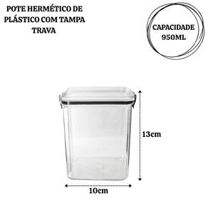Capacidade: 950ml – tamanho ideal para armazenar diversos tipos de alimentos. Material: Plástico resistente e livre de BPA, garantindo segurança para os alimentos. Vedação hermética: Tampa com fechamento seguro que mantém os alimentos frescos por mais tempo. Transparente: Facilita a visualização do conteúdo sem precisar abrir.