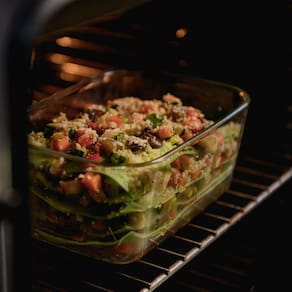 O pote de vidro hermético de 370ml acompanha você em todas as etapas no preparo das refeições, suportando temperaturas de até 220°C no forno ou air fryer e -20°C no freezer.