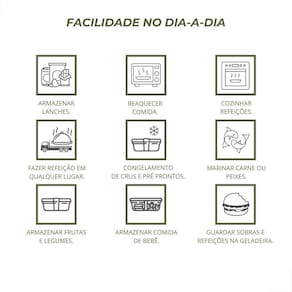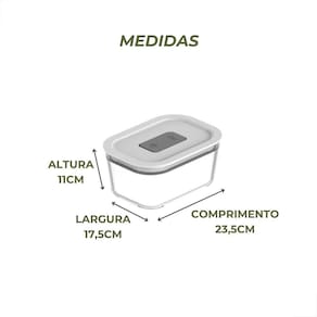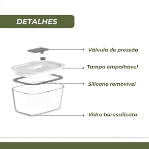 Capacidade Ideal: Com 2,400l, é perfeito para armazenar pequenas porções de alimentos, como molhos, temperos, e sobras de refeições. Sistema Hermético Avançado: A tampa com válvula de ar cria um ambiente selado que preserva a frescura e evita a entrada de umidade e odores. Válvula de Segurança: O pote só abre e fecha quando a válvula está aberta, garantindo segurança e vedação total. Material de Alta Qualidade: Feito de vidro resistente, é seguro para uso alimentar e não absorve odores ou manchas. Design Transparente: Permite visualizar facilmente o conteúdo, facilitando a identificação dos alimentos armazenados. Fácil de Limpar: Tanto o vidro quanto a tampa são laváveis na máquina de lavar louças, proporcionando praticidade no dia a dia. Benefícios: