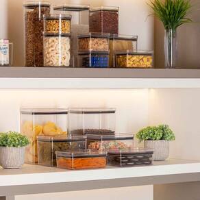 Seu design transparente permite a fácil visualização do conteúdo, enquanto sua estrutura empilhável otimiza o espaço em despensas, armários e gavetas.