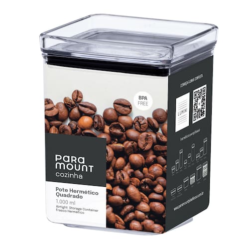 Pote Hermético Lumini Quadrado 1.000 ml Pote de armazenamento com vedação hermética, essencial para conservar a qualidade e o frescor de alimentos secos como grãos, café e farinhas. Com capacidade de 1.000 ml, seu formato quadrado e material transparente (Poliestireno) facilitam o empilhamento e otimizam o espaço em armários e despensas, além de permitir a fácil visualização do conteúdo. Especificações técnicas: Código: 1162 Marca: Paramount Kit composto de: 1 Pote Hermético Cor: Transparente Material: Poliestireno Peso: 0,2 g Altura: 14,5 cm Largura: 10,5 cm Comprimento: 10,5 cm