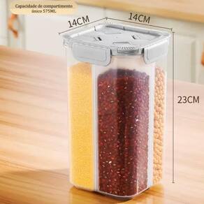 - Este frasco de armazenamento de alimentos tem 4 tampas em 1 recipiente e tem uma divisória separada entre 4 tampas para que possa armazenar 4 alimentos. - Sua tampa é desmontável, facilitando assim a sua limpeza. - Capacidade: 2.3 litros - Material: PP + TPE - Tamanho: 140 x 230cm