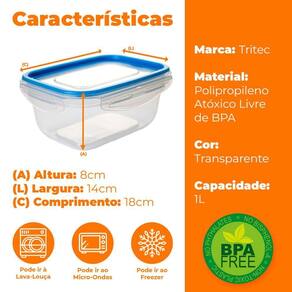 Com dimensões de 18cm de comprimento, 14cm de largura e 8cm de altura, o pote Tritec oferece o espaço ideal para guardar uma variedade de alimentos e pode ser empilhado, otimizando o espaço da sua geladeira, freezer ou armários.