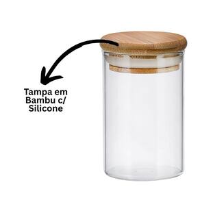 Material: Vidro borossilicato (pote) + bambu com silicone (tampa)