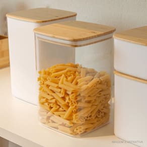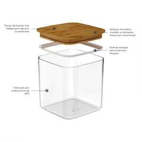 O pote hermético de 2,3 litros armazena os alimentos com cuidado e sofisticação. Sua tampa de bambu adiciona um toque de sustentabilidade e beleza à decoração da casa. Ideal para armazenar mantimentos como arroz, feijão, massas e biscoitos, o pote conserva os alimentos por mais tempo graças à vedação hermética que impede a entrada de ar. Produzido com material livre de BPA, é seguro para uso e não oferece riscos à saúde.