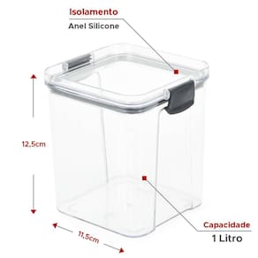 - Capacidade 1 litro - Pode ser empilhado, Tampa com Sistema de Empilhamento - Isolamento em Silicone com Travas - Dimensões 12,5 x 11,5 altura x largura