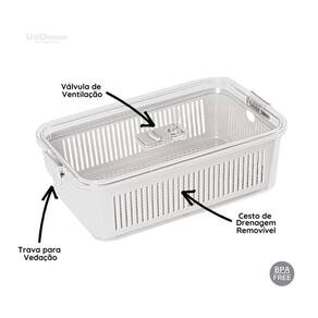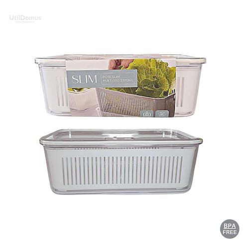 Pote hermético slim multiuso com cesto de drenagem 2.570ml O pote slim é usado para acondicionar alimentos na geladeira, como: frutas, verduras, legumes, hortaliças, saladas e outros. Devido a sua versatilidade, são utilizados para armazenar alimentos em armários e despensas. Alimentos conservados no pote têm maior durabilidade, evitando desperdícios. Possui tampa hermética com travas de segurança nas laterais, válvula de ventilação para a retirada da umidade e cesto de drenagem removível que impede o contato do alimento com a água acumulada no seu interior. São empilháveis com outras peças da linha slim, possibilitando a otimização do espaço na geladeira. Bpa free - produto livre de bisfenol a. Material: poliestireno e polipropilenoFormato: retangularCor: transparente e brancoCapacidade: 2570mlDimensões: (l x c x a) 26,5 x 16,5 x 8,9cmPeso: kgLinha do produto e referência: slim (1771)Marca: paramount plásticosOrigem do produto: nacional Contém na embalagem: 01 pote slim multiuso com cesto de drenagem 2570ml Os demais componentes das fotos são meramente ilustrativos. Garantia contra defeito de fabricação. Limpeza e conservação: Utilize pano macio, esponja macia e detergente neutro. Não utilize materiais abrasivos, saponáceos, substâncias cloradas, lado áspero da esponja e palha de aço. Não utilize em freezers, micro-ondas, lava-louças e fornos elétricos.