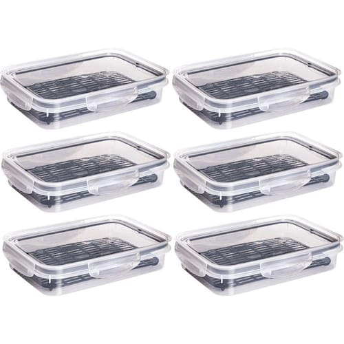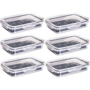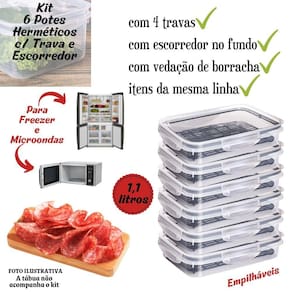 Conjunto com 6 potes plásticos com capacidade para 1,1 litros. Possuem silicone na tampa e travas laterais para uma melhor vedação e conservação do alimento. Seu escorredor inferior mantém os alimentos longe do contato com resíduos que podem se formar no fundo. Produzido em material atóxico, pode ser utilizado no freezer e no micro-ondas.