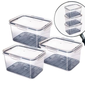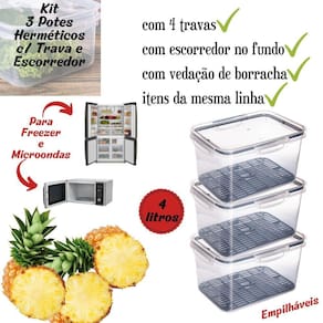 Conjunto com 3 potes plásticos com capacidade para 4 litros. Possuem silicone na tampa e travas laterais para uma melhor vedação e conservação do alimento. Seu escorredor inferior mantém os alimentos longe do contato com resíduos que podem se formar no fundo. Produzido em material atóxico, pode ser utilizado no freezer e no micro-ondas.