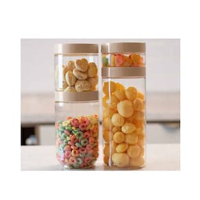 Contem: 1 Pote de 1200 ml Medidas: 21 x 9,4 cm 1 Pote de 900 ml Medidas: 16 x 9,4 cm 1 Pote de 600 ml Medidas: 11 x 9,4 cm 1 Pote de 300 ml Medidas: 6 x 9,4 cm Materia: PET (PP)