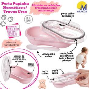 Porta Papinha Hermético Rosa com tampa incolor e vedação de borracha, porta colher e trava dupla nas laterais, com decoração infantil lúdica de urso e uma colher.